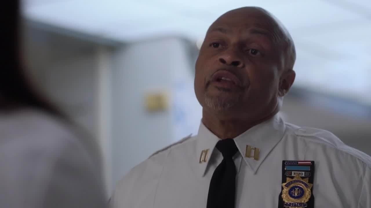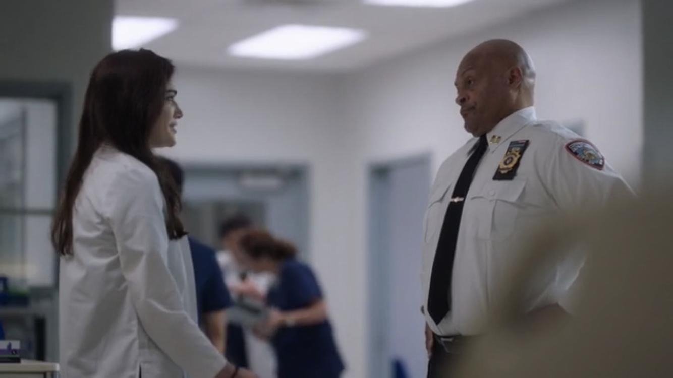 HBO - Police Sargent Thomas played by Guy A Fortt at front office desk answering questions from Jessica jones played by Kristen Ritter.